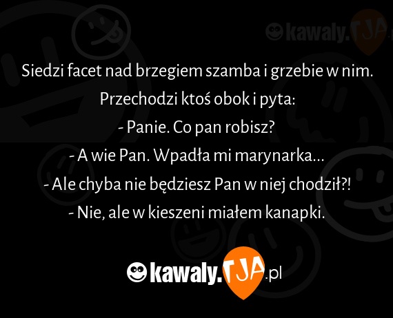 Siedzi facet nad brzegiem szamba i grzebie w nim. Przechodzi ktoś obok i pyta: - Panie. Co pan robisz? - A wie Pan. Wpadła mi marynarka... - Ale chyba nie będziesz Pan w niej chodził?! - Nie, ale w kieszeni miałem kanapki.