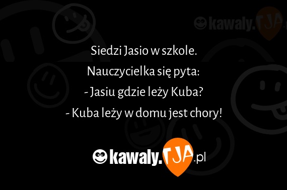 Siedzi Jasio w szkole. Nauczycielka sie pyta: - Jasiu gdzie lezy Kuba? - Kuba lezy w domu jest chory!