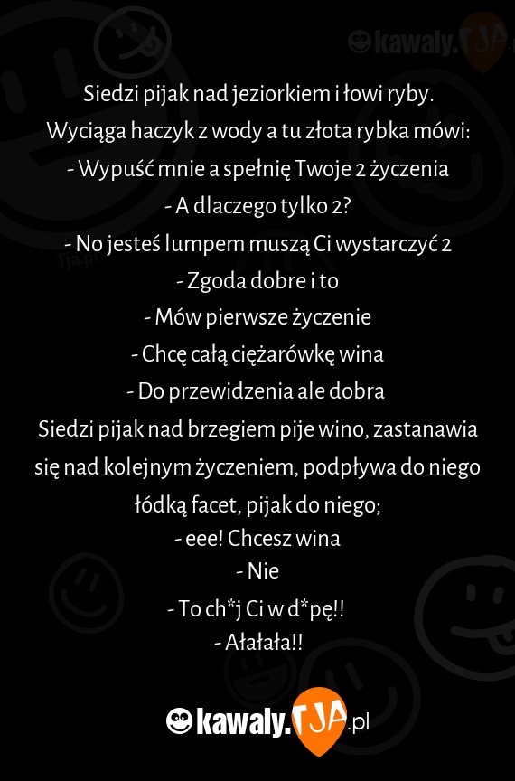 Siedzi pijak nad brzegiem pije wino, zastanawia się nad kolejnym życzeniem, podpływa do niego łódką facet, pijak do niego;