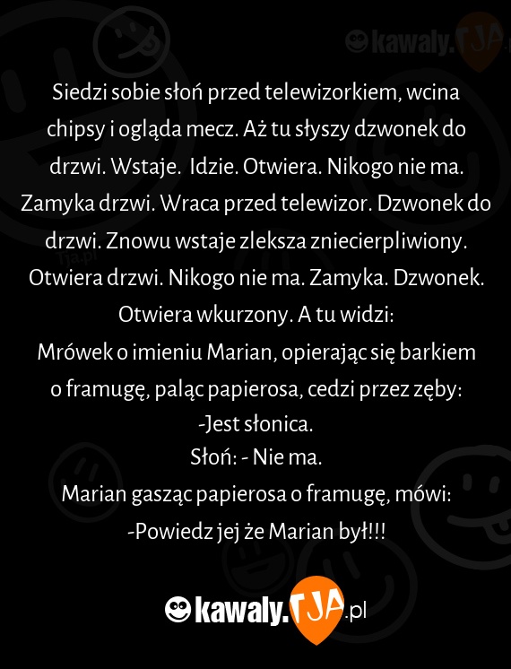 Siedzi sobie słoń przed telewizorkiem, wcina chipsy i ogląda mecz. Aż tu słyszy dzwonek do drzwi. Wstaje. Idzie. Otwiera. Nikogo nie ma. Zamyka drzwi. Wraca przed telewizor. Dzwonek do drzwi. Znowu wstaje zleksza zniecierpliwiony. Otwiera drzwi. Nikogo nie ma. Zamyka. Dzwonek. Otwiera wkurzony. A tu widzi: