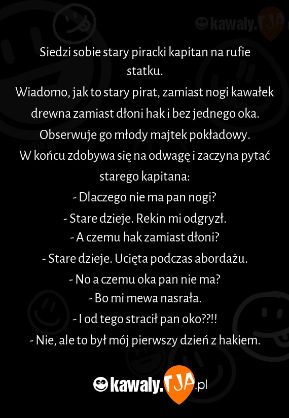 Wiadomo, jak to stary pirat, zamiast nogi kawałek drewna zamiast dłoni hak i bez jednego oka.