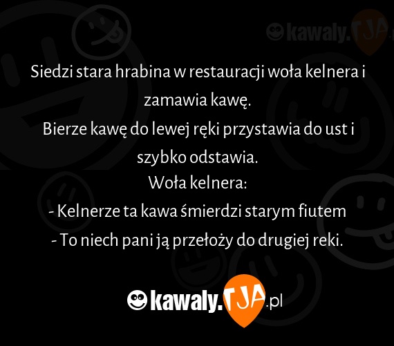 Siedzi stara hrabina w restauracji wola kelnera i zamawia kawe. Bierze kawe do lewej reki przystawia do ust i szybko odstawia. Wola kelnera: - Kelnerze ta kawa smierdzi starym fiutem - To niech pani ja przelozy do drugiej reki.
