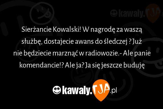 Sierżancie Kowalski! W nagrodę za waszą służbę, dostajecie awans do śledczej ? Już nie będziecie marznąć w radiowozie.- Ale panie komendancie!? Ale ja? Ja się jeszcze buduję