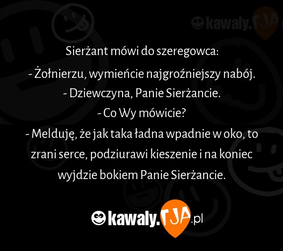 Sierżant mówi do szeregowca: - Żołnierzu, wymieńcie najgroźniejszy nabój. - Dziewczyna, Panie Sierżancie. - Co Wy mówicie? - Melduję, że jak taka ładna wpadnie w oko, to zrani serce, podziurawi kieszenie i na koniec wyjdzie bokiem Panie Sierżancie.