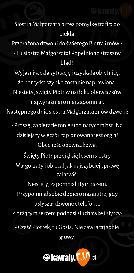 Święty Piotr przejął się losem siostry Małgorzaty i obiecał jak najszybciej sprawę załatwić.