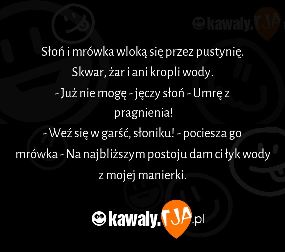 Slon i mrowka wloka sie przez pustynie. Skwar, zar i ani kropli wody. - Juz nie moge - jeczy slon - Umre z pragnienia! - Wex sie w garsc, sloniku! - pociesza go mrowka - Na najblizszym postoju dam ci lyk wody z mojej manierki.
