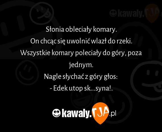 Slonia oblecialy komary. On chcac sie uwolnic wlazl do rzeki. Wszystkie komary polecialy do gory, poza jednym. Nagle slychac z gory glos: - Edek utop sk...syna!.