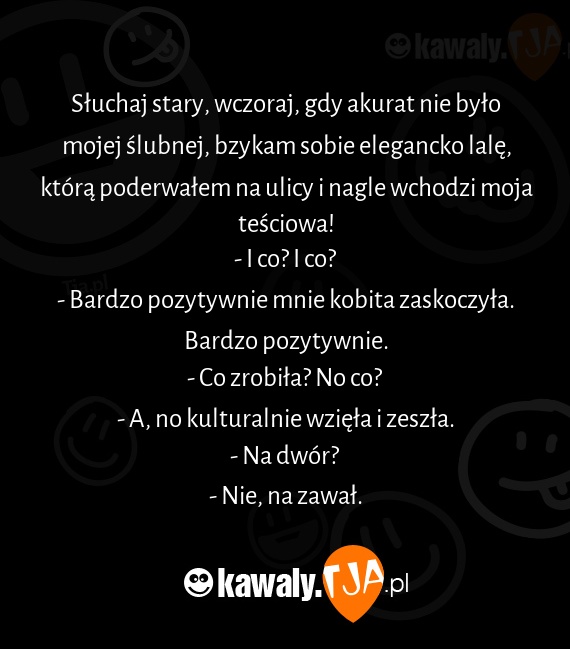 Słuchaj stary, wczoraj, gdy akurat nie było mojej ślubnej, bzykam sobie elegancko lalę, którą poderwałem na ulicy i nagle wchodzi moja teściowa!