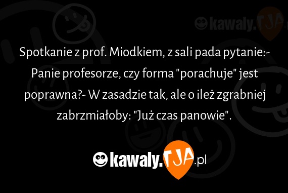 Spotkanie z prof. Miodkiem, z sali pada pytanie:- Panie profesorze, czy forma "porachuje" jest poprawna?- W zasadzie tak, ale o ileż zgrabniej zabrzmiałoby: "Już czas panowie".