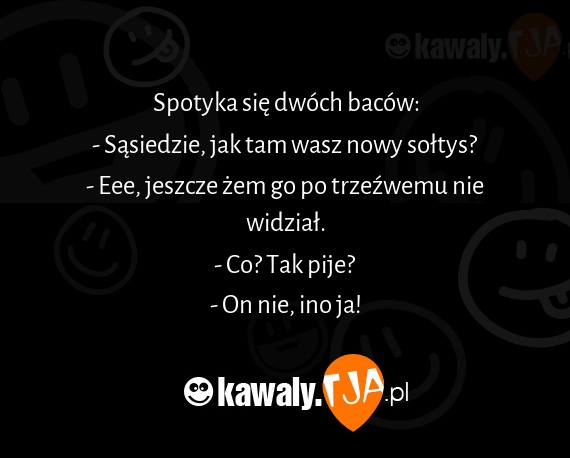 Spotyka sie dwoch bacow: - Sasiedzie, jak tam wasz nowy soltys? - Eee, jeszcze zem go po trzexwemu nie widzial. - Co? Tak pije? - On nie, ino ja!