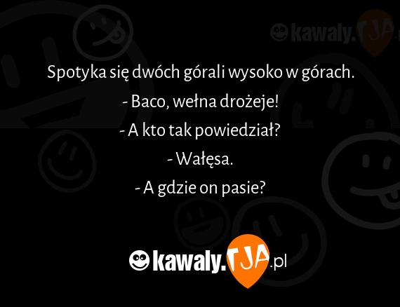 Spotyka się dwóch górali wysoko w górach. - Baco, wełna drożeje! - A kto tak powiedział? - Wałęsa. - A gdzie on pasie?