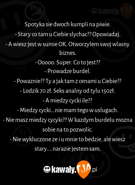 - Nie masz miedzy cycyki?? W kazdym burdelu mozna sobie na to pozwolic.