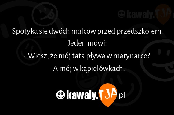 Spotyka się dwóch malców przed przedszkolem. Jeden mówi: - Wiesz, że mój tata pływa w marynarce? - A mój w kąpielówkach.