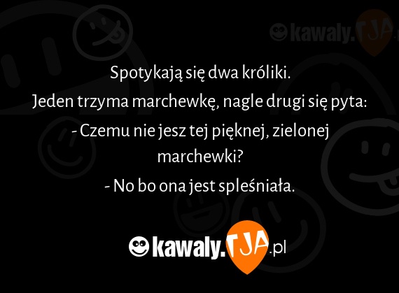 Spotykają się dwa króliki. Jeden trzyma marchewkę, nagle drugi się pyta: - Czemu nie jesz tej pięknej, zielonej marchewki? - No bo ona jest spleśniała.