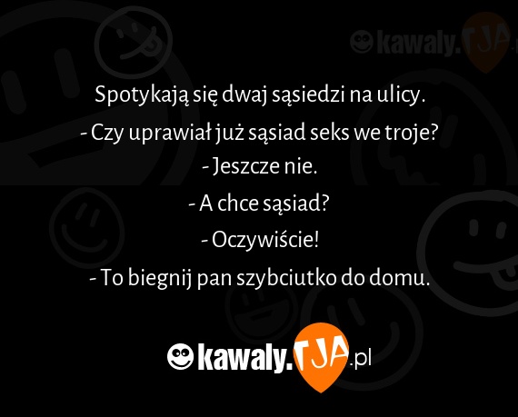 Spotykają się dwaj sąsiedzi na ulicy. - Czy uprawiał już sąsiad seks we troje? - Jeszcze nie. - A chce sąsiad? - Oczywiście! - To biegnij pan szybciutko do domu.