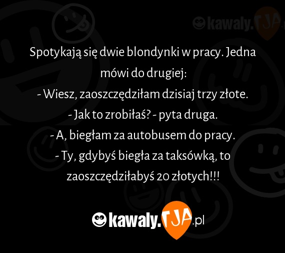 Spotykają się dwie blondynki w pracy. Jedna mówi do drugiej: - Wiesz, zaoszczędziłam dzisiaj trzy złote. - Jak to zrobiłaś? - pyta druga. - A, biegłam za autobusem do pracy. - Ty, gdybyś biegła za taksówką, to zaoszczędziłabyś 20 złotych!!!