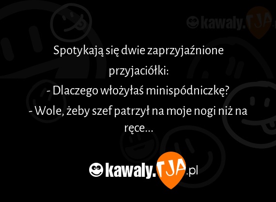 Spotykają się dwie zaprzyjaźnione przyjaciółki: - Dlaczego włożyłaś minispódniczkę? - Wole, żeby szef patrzył na moje nogi niż na ręce...
