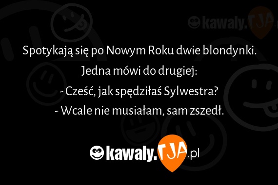Spotykaja sie po Nowym Roku dwie blondynki. Jedna mowi do drugiej: - Czesc, jak spedzilas Sylwestra? - Wcale nie musialam, sam zszedl.