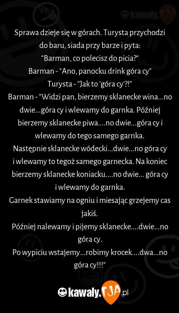 Sprawa dzieje się w górach. Turysta przychodzi do baru, siada przy barze i pyta: