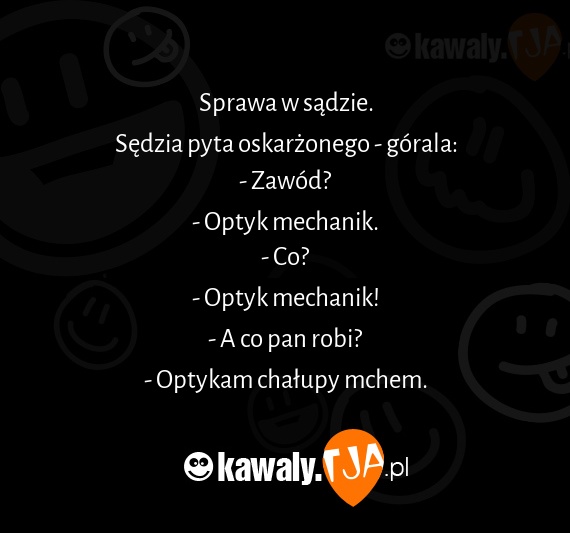 Sprawa w sadzie. Sedzia pyta oskarzonego - gorala: - Zawod? - Optyk mechanik. - Co? - Optyk mechanik! - A co pan robi? - Optykam chalupy mchem.
