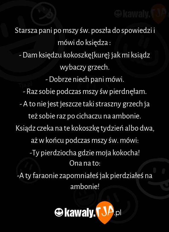 Starsza pani po mszy św. poszła do spowiedzi i mówi do księdza :