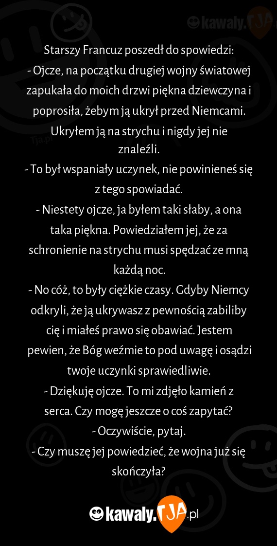 - Ojcze, na początku drugiej wojny światowej zapukała do moich drzwi piękna dziewczyna i poprosiła, żebym ją ukrył przed Niemcami. Ukryłem ją na strychu i nigdy jej nie znaleźli.