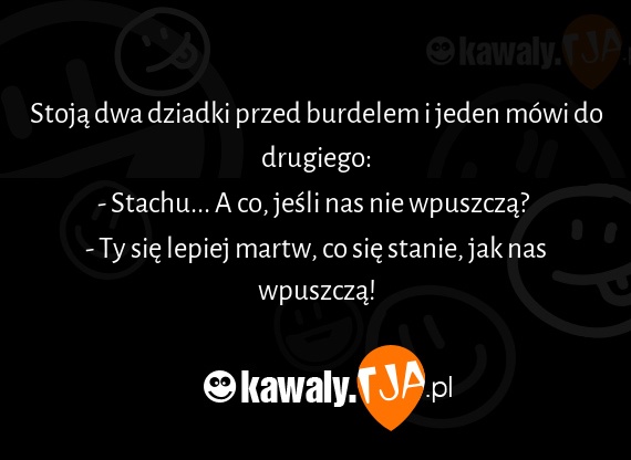 Stoją dwa dziadki przed burdelem i jeden mówi do drugiego: - Stachu... A co, jeśli nas nie wpuszczą? - Ty się lepiej martw, co się stanie, jak nas wpuszczą!