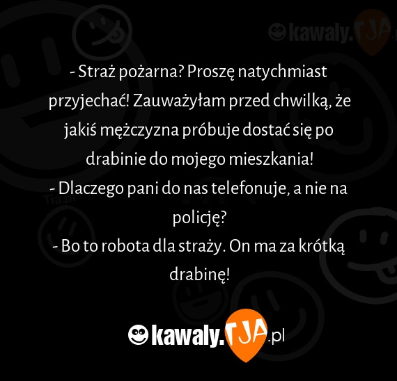 - Straż pożarna? Proszę natychmiast przyjechać! Zauważyłam przed chwilką, że jakiś mężczyzna próbuje dostać się po drabinie do mojego mieszkania!