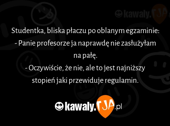 Studentka, bliska placzu po oblanym egzaminie: - Panie profesorze ja naprawde nie zasluzylam na pale. - Oczywiscie, ze nie, ale to jest najnizszy stopien jaki przewiduje regulamin.