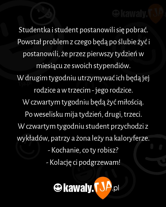 W czwartym tygodniu student przychodzi z wykładów, patrzy a żona leży na kaloryferze.