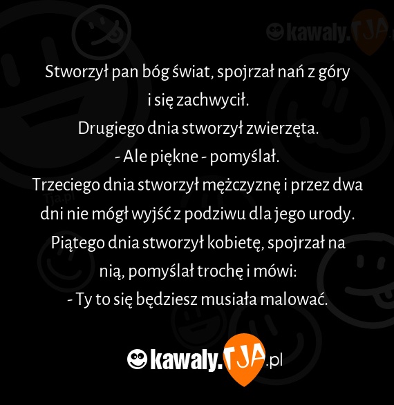Piątego dnia stworzył kobietę, spojrzał na nią, pomyślał trochę i mówi: