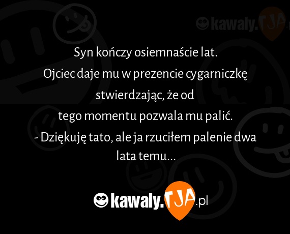 Syn kończy osiemnaście lat. Ojciec daje mu w prezencie cygarniczkę stwierdzając, że od tego momentu pozwala mu palić. - Dziękuję tato, ale ja rzuciłem palenie dwa lata temu...