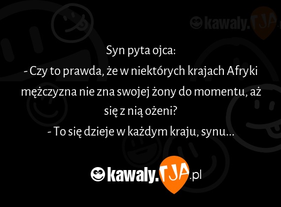 Syn pyta ojca: - Czy to prawda, ze w niektorych krajach Afryki mezczyzna nie zna swojej zony do momentu, az sie z nia ozeni? - To sie dzieje w kazdym kraju, synu...