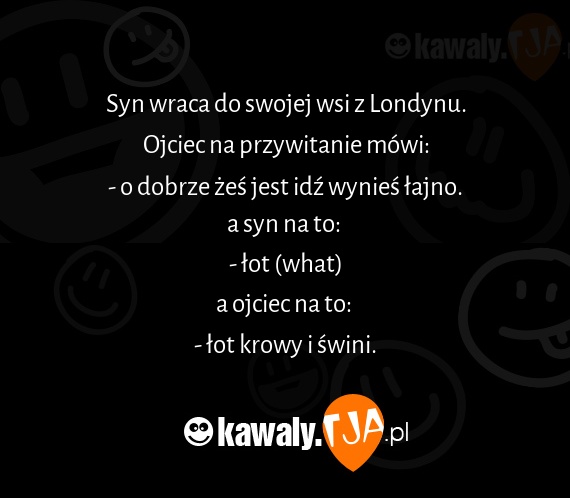 Syn wraca do swojej wsi z Londynu. Ojciec na przywitanie mówi: - o dobrze żeś jest idź wynieś łajno. a syn na to: - łot (what) a ojciec na to: - łot krowy i świni.