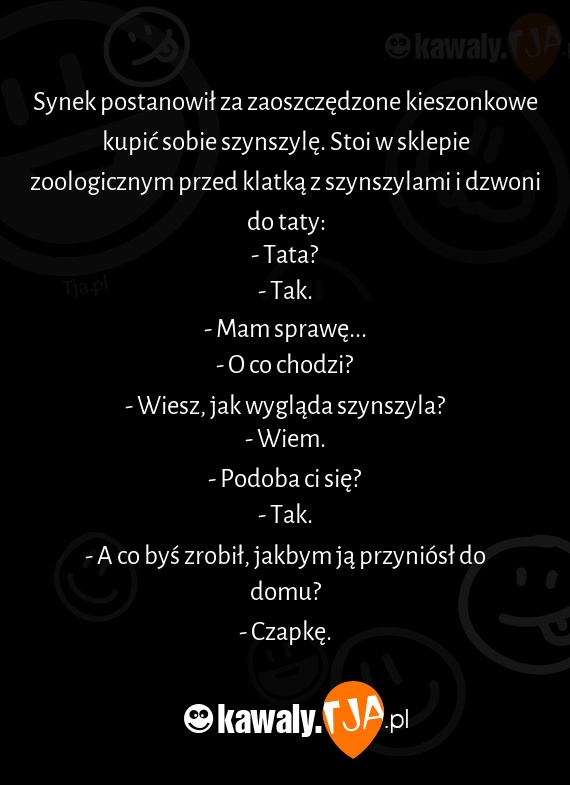 Synek postanowił za zaoszczędzone kieszonkowe kupić sobie szynszylę. Stoi w sklepie zoologicznym przed klatką z szynszylami i dzwoni do taty: