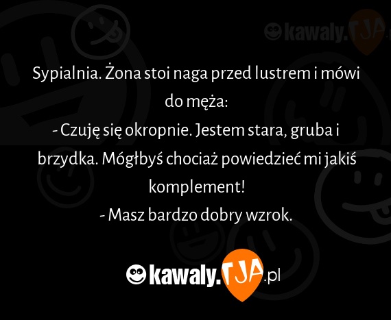 Sypialnia. Żona stoi naga przed lustrem i mówi do męża: - Czuję się okropnie. Jestem stara, gruba i brzydka. Mógłbyś chociaż powiedzieć mi jakiś komplement! - Masz bardzo dobry wzrok.