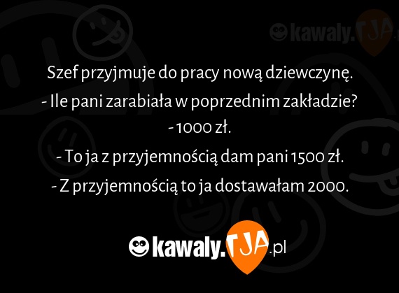Szef przyjmuje do pracy nową dziewczynę. - Ile pani zarabiała w poprzednim zakładzie? - 1000 zł. - To ja z przyjemnością dam pani 1500 zł. - Z przyjemnością to ja dostawałam 2000.