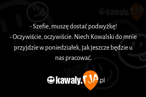 - Szefie, musze dostac podwyzke! - Oczywiscie, oczywiscie. Niech Kowalski do mnie przyjdzie w poniedzialek, jak jeszcze bedzie u nas pracowac.
