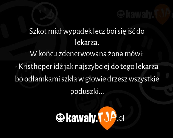 Szkot miał wypadek lecz boi się iść do lekarza. W końcu zdenerwowana żona mówi: - Kristhoper idź jak najszybciej do tego lekarza bo odłamkami szkła w głowie drzesz wszystkie poduszki...