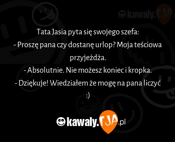 Tata Jasia pyta sie swojego szefa: - Prosze pana czy dostane urlop? Moja tesciowa przyjezdza. - Absolutnie. Nie mozesz koniec i kropka. - Dziekuje! Wiedzialem ze moge na pana liczyc :)