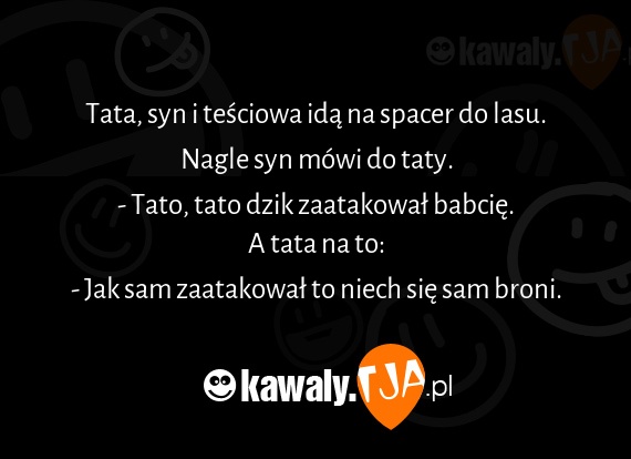 Tata, syn i tesciowa ida na spacer do lasu. Nagle syn mowi do taty. - Tato, tato dzik zaatakowal babcie. A tata na to: - Jak sam zaatakowal to niech sie sam broni.