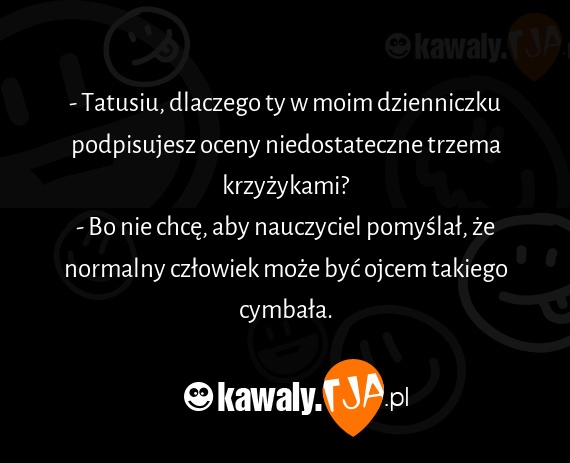 - Tatusiu, dlaczego ty w moim dzienniczku podpisujesz oceny niedostateczne trzema krzyzykami? - Bo nie chce, aby nauczyciel pomyslal, ze normalny czlowiek moze byc ojcem takiego cymbala.