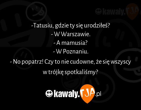 -Tatusiu, gdzie ty się urodziłeś? - W Warszawie. - A mamusia? - W Poznaniu. - No popatrz! Czy to nie cudowne, że się wszyscy w trójkę spotkaliśmy?