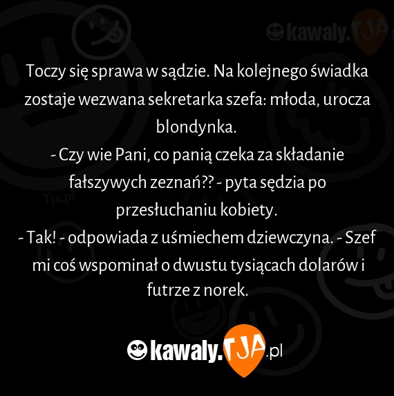 Toczy się sprawa w sądzie. Na kolejnego świadka zostaje wezwana sekretarka szefa: młoda, urocza blondynka.