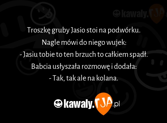 Troszkę gruby Jasio stoi na podwórku. Nagle mówi do niego wujek: - Jasiu tobie to ten brzuch to całkiem spadł. Babcia usłyszała rozmowę i dodała: - Tak, tak ale na kolana.