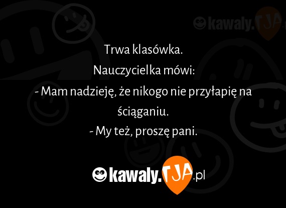 Trwa klasówka. Nauczycielka mówi: - Mam nadzieję, że nikogo nie przyłapię na ściąganiu. - My też, proszę pani.