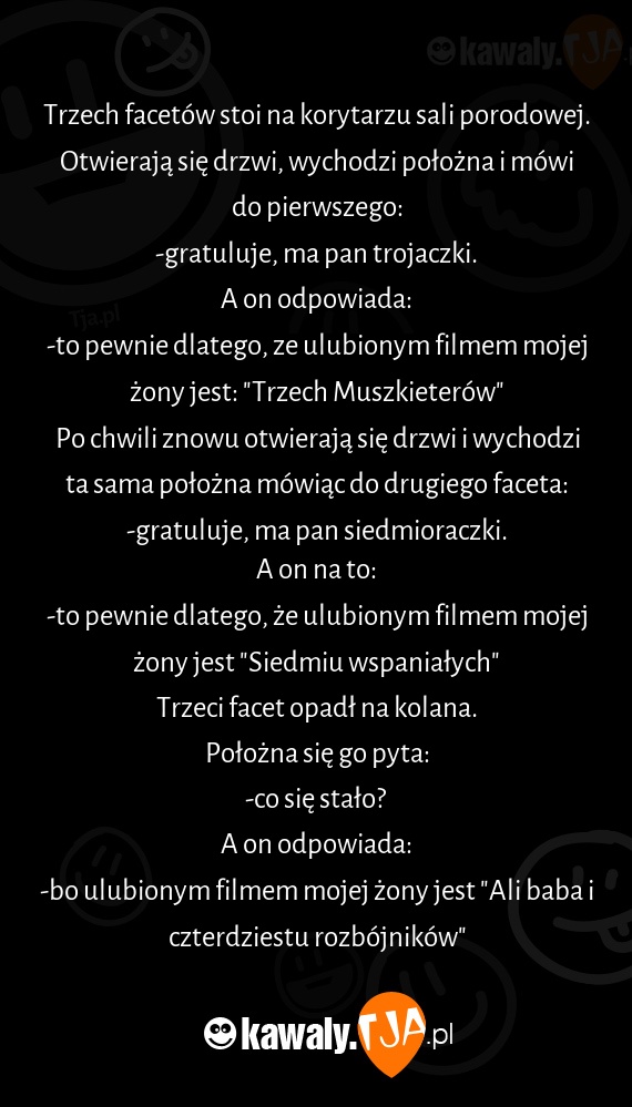 Otwierają się drzwi, wychodzi położna i mówi do pierwszego: