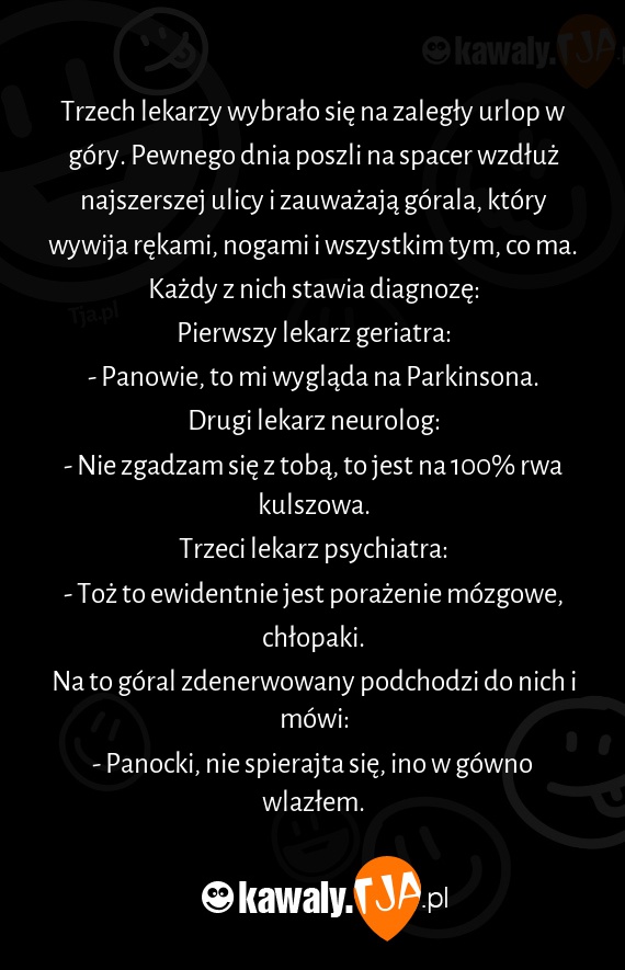 Trzech lekarzy wybrało się na zaległy urlop w góry. Pewnego dnia poszli na spacer wzdłuż najszerszej ulicy i zauważają górala, który wywija rękami, nogami i wszystkim tym, co ma. Każdy z nich stawia diagnozę: