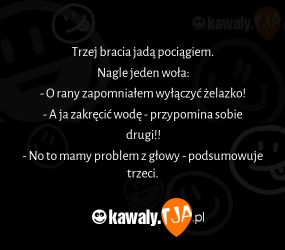 Trzej bracia jadą pociągiem. Nagle jeden woła: - O rany zapomniałem wyłączyć żelazko! - A ja zakręcić wodę - przypomina sobie drugi!! - No to mamy problem z głowy - podsumowuje trzeci.