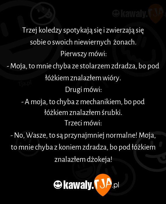 - No, Wasze, to są przynajmniej normalne! Moja, to mnie chyba z koniem zdradza, bo pod łóżkiem znalazłem dżokeja!
